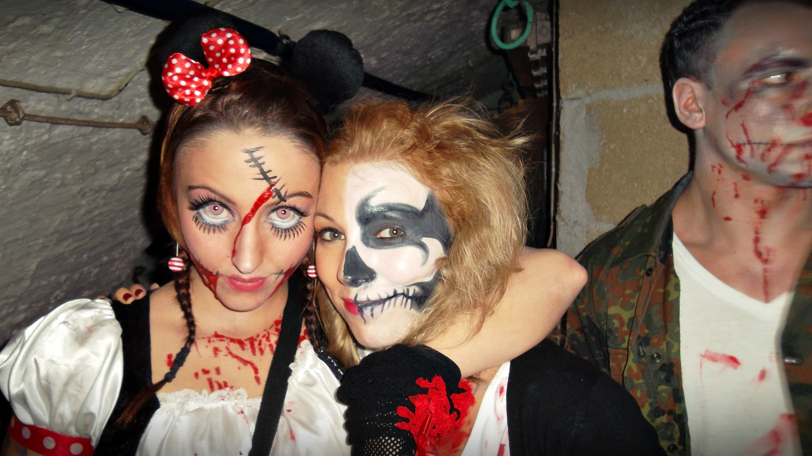 Ich stand ja extreeemst unter Zeitdruck an dem abend und hatte den Plan für mein Make-Up und Outfit ja wirklich nur im Kopf… und da ich 2 Stunden fürs Make-Up gebraucht habe, da extreeemst ungeübt und absolute Niete in mehr wie alltäglichem Make-Up, musste das Outfit innerhalb von ca 10 Minuten entstehen. Hier war ich recht dankbar für die H&M 9€ Schuhe, die lieb ich nämlich und hab daher ein seeehr dreckiges und ein mittel dreckiges Paar. Das sehr dreckige begleitet mich gerne auf die versautesten Tanzflächen im Umkreis und daher war es keine Frage, da ein bisschen vom Kunstblut drauf zu verteilen! Das erste mal künstliche Wimpern hat durch den vorherigen Genuss von Weinschorle erstaunlich gut geklappt. Da macht man sich weniger Gedanken und haut den Scheiss einfach drauf. Trotz allem… so ne Scheisse tu ich mir echt nicht nochmal an. Für mich so allein definitiv zu viel Arbeit. Ich bin nicht der Wahnsinns-Schminktyp und hab für sowas einfach zu wenig Geduld. Auch wenn ich schon ein bisschen stolz war auf das Endergebnis 🙂 So, genug gequatscht… es war eine tolle Nacht. Es wurde getanzt, getrunken, geschwitzt, gestolpert, gelacht und dumm gschwetzt.