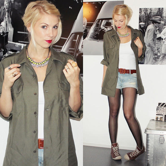 Für was Zara wenn auch Second Hand geht und dazu dann irgendwie auch noch cooler aussieht! Wer kennt sie nicht, die Zara-Khaki-Dekosteinchen-Hemden … momentan trägt sie fast jede zweite Bloggerin. Ich finde sie auch super schön und war bereits kurz davor sie zu kaufen. Aber irgendwo stört es mich wenn sie überall zu sehen sind, denn ich mag nicht aussehen wie jede. Also habe ich nach Alternativen gesucht. Im Second Hand Shop um die Ecke habe ich dieses verdammt coole Bundeswehrhemd gefunden. Zum unschlagbaren Preis von 5 Euro. Ja leck mich am Hemd! Bei meinem heutigen Look präsentiere ich Euch verschiedene Varinaten wie man das gute Stück tragen kann. Sicher sieht es auch als Kleid mit einem Taillengürtel super aus, aber da wäre es für mich dann doch etwas zu knapp geworden. Ja und zu Olympia-Zeiten sollte man auch etwas zu seinem Land stehen, selbst wenn es mit Gold bisher nur ein paar Mal klappen wollte. Mir persönlich gefällt die Version mit dem offenen Hemd übrigens am Besten! Welche ist Euer Favorit? Ich werde mir in naher Zukunft wohl auch noch den passenden Bundeswehrparka zulegen. Im Second Hand Laden kosten sie meist nicht mehr als 15-20 Euro.