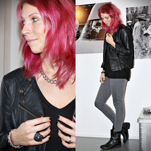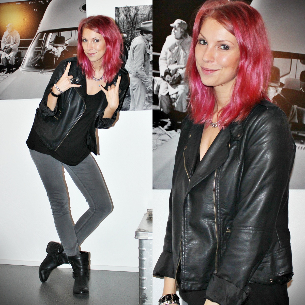 Ich muss ehrlich zugeben, dass die Haare auf den Bildern besser aussehen als in der Realität. Für mich nicht weiter schlimm! Ich hatte mich gegen eine Blondierung entschieden, um den Haaren nicht noch zusätzlich zu schaden und ein schnelleres Auswaschen zu gewährleisten. Nur für den Fall, dass es schief gegangen wäre. Trotzdem ist es am Ansatz und teilweise im Unterhaar schon fast komplett raus, während der untere Teil noch ziemlich kräftig ist. Scheinbar wirke ich auch auf Obstmücken wie eine reife Himbeere. Hier kreist nämlich schon seit einer Stunde eine ganz fröhlich um mich herum. Um weitere Irritationen dieser Art zu vermeiden und auch die Tierwelt nicht in den Wahnsinn zu treiben, wird mir meiner Schwester die Tage das Cleanse Shampoo von Directions besorgen. Aber ganz ehrlich, auch wenn das Pink nich lange drin war, vermissen werde ich es schon. Da pink aber hervorragend zu rockig und abgefuckt passt, hier ein passendes Outfit. Ein All in Black Look mit Lederjacke, Bikerboots und Skinnyjeans. Mit pinken Haaren ist man kleidungstechnisch nämlich stark eingeschräkt. Gewisse Farben kann man schlichtweg nicht mehr tragen. Mit neutralen Tönen wie weiss, schwarz und grau kann man dagegen nichts falsch machen.