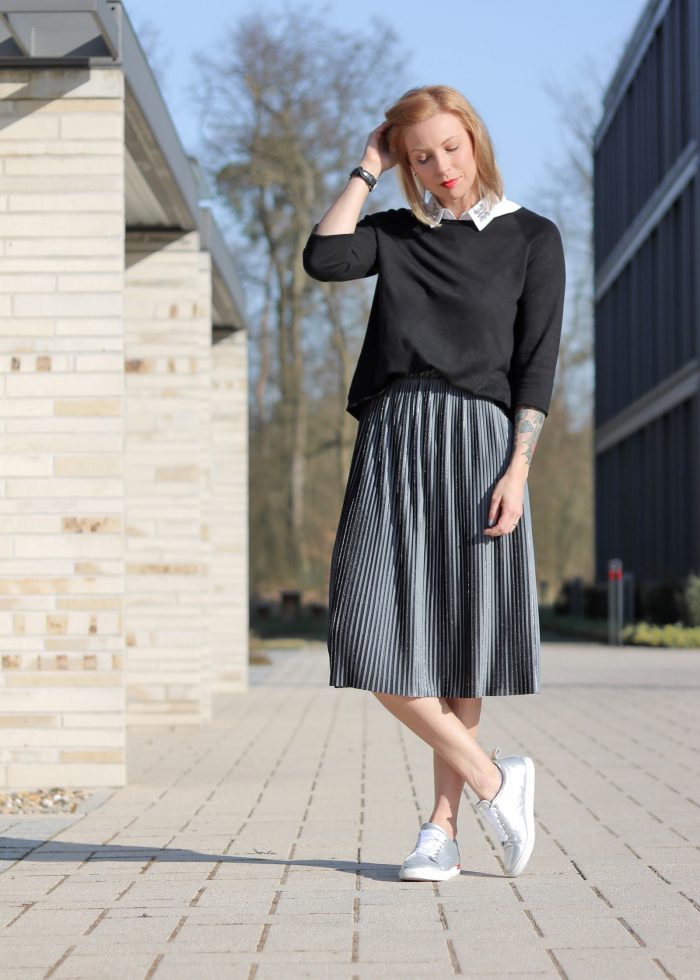 Outfit Faltenrock Sneaker silber metallic Scarosso Sweater Blusenkragen 01 (11) 28. März 2017 by Lavie Lavie