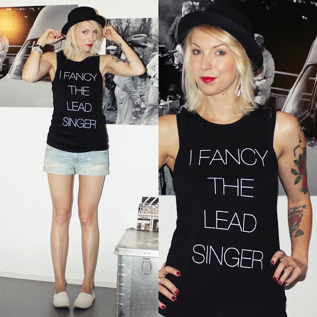 Ich musste es einfach kaufen, da es bei mir tatsächlich auch zutrifft. Mein Herz ist Lead Sänger und das Shirt passt somit wie die Faust auf’s Auge! Statementshirts sind wieder hoch im Trend. Man benötigt nicht viel um sie lässig zu kombinieren. Sie wirken für sich alleine. Daher habe ich mich für schlichte Jeansshorts und weisse Stoffsneaker entschieden. Als Accessoire habe ich zum Lieblingshut gegriffen – der Melone. Dazu noch rote Lippen und der Groupielook ist perfekt.