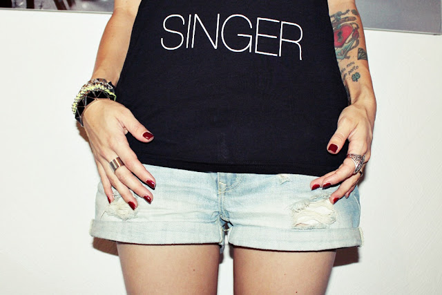 Ich musste es einfach kaufen, da es bei mir tatsächlich auch zutrifft. Mein Herz ist Lead Sänger und das Shirt passt somit wie die Faust auf’s Auge! Statementshirts sind wieder hoch im Trend. Man benötigt nicht viel um sie lässig zu kombinieren. Sie wirken für sich alleine. Daher habe ich mich für schlichte Jeansshorts und weisse Stoffsneaker entschieden. Als Accessoire habe ich zum Lieblingshut gegriffen – der Melone. Dazu noch rote Lippen und der Groupielook ist perfekt.