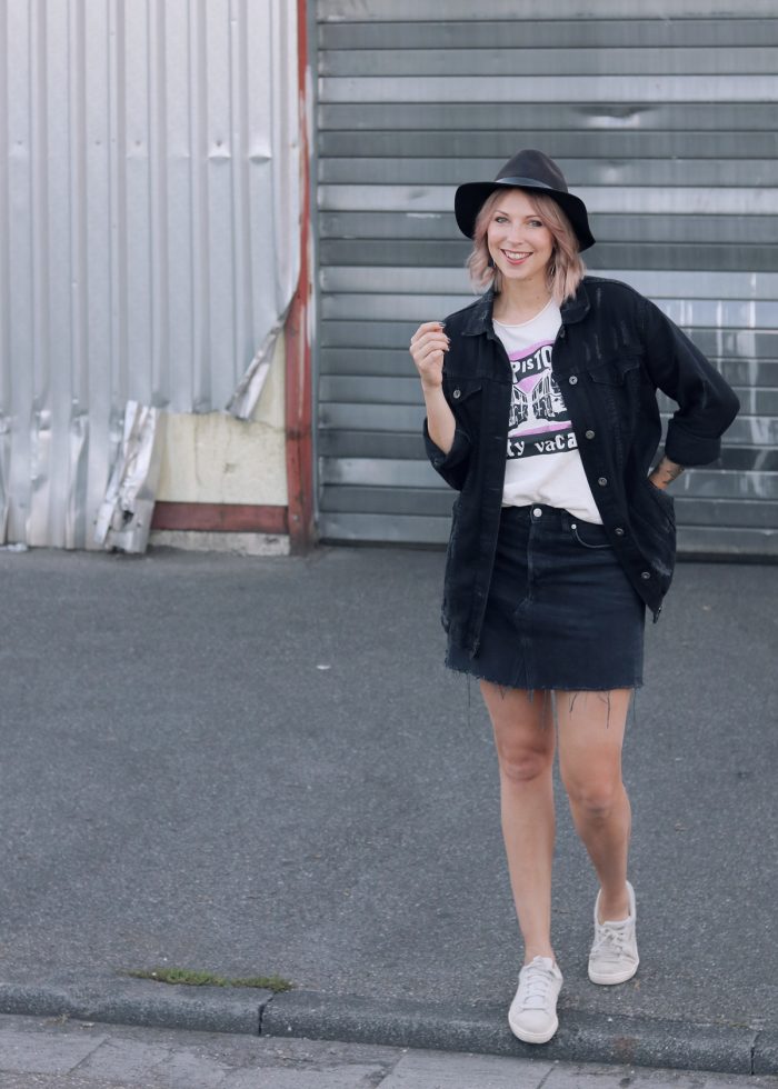 Outfit schwarzer Jeansrock Bandshirt Sex Pistols Oversized Jeansjacke Pull Bear Hut Puma Sneaker beige (21) 11. September 2018 by Lavie Lavie