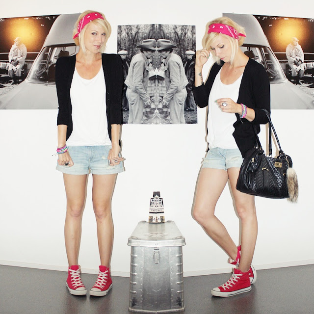 Cardigan – Zara | Top, Shorts – H&M | Pinke Cucks – Converse | Bandana – Killerkirsche | Tasche – Vans