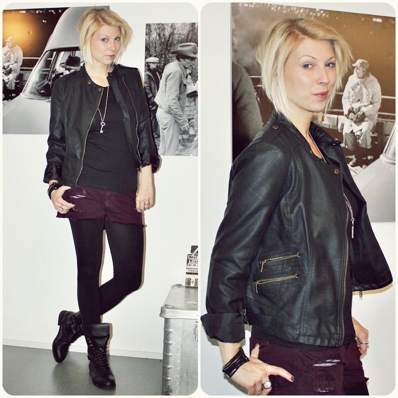 Cardigan – Zara | Top, Shorts, Fuchsschwanz – H&M | Lederjacke – Clockhouse