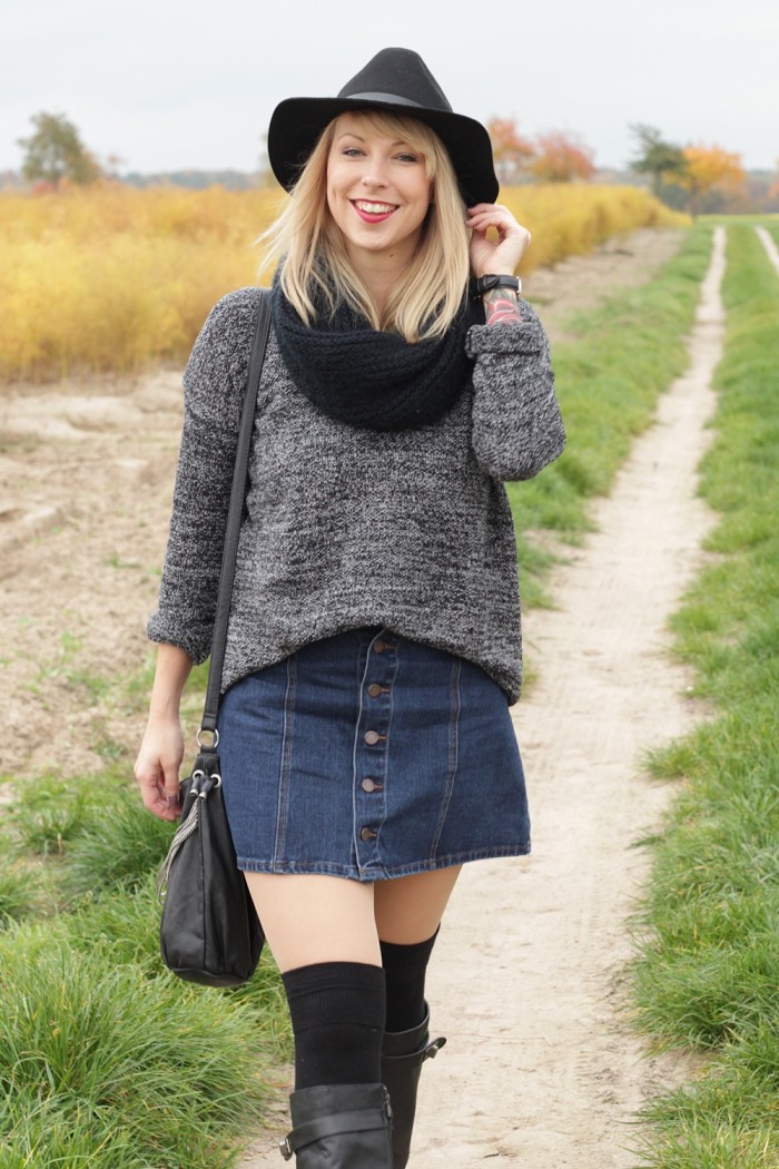 Outfit Fashionbloggerin Karlsruhe Jeansrock Knopfleiste Overknees Hut Strickpulli 1 (9) 9. November 2015 by Lavie Lavie